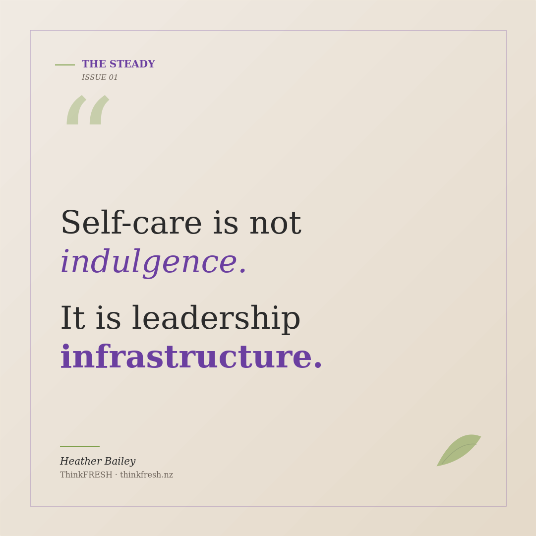 The small acts of self-tending — the proper breakfast, the ten-minute walk, the hard no to the 5pm meeting — are not distractions from your leadership. They ARE your leadership. They are what allows you to show up on Tuesday morning with the clarity and kindness that your team, your clients, and your own integrity deserve.