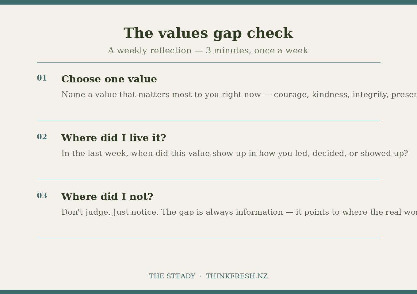 Not to judge yourself. Not to add to the pile of things you're getting wrong. Just to notice. Because the gap between our stated values and our lived experience is always information. It usually points directly at where the pressure is, where the fear is, or where we've been running on empty.